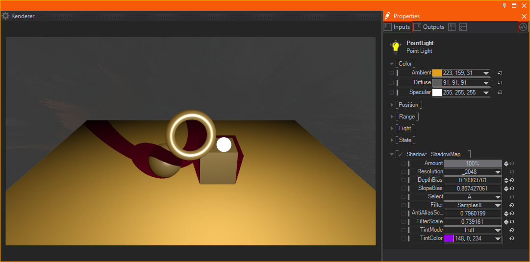 With the help of the Tint properties you can tint your shadows. This will apply the specified TintColor to the BaseColor of the affected objects after multiplying it with the AmbientColor of your light. The TintMode defines how the Tint should be applied: Full will apply the Tint Color everywhere in the same amount. Attenuated will linearly fade out the amount of the Tint over the distance to the light source.