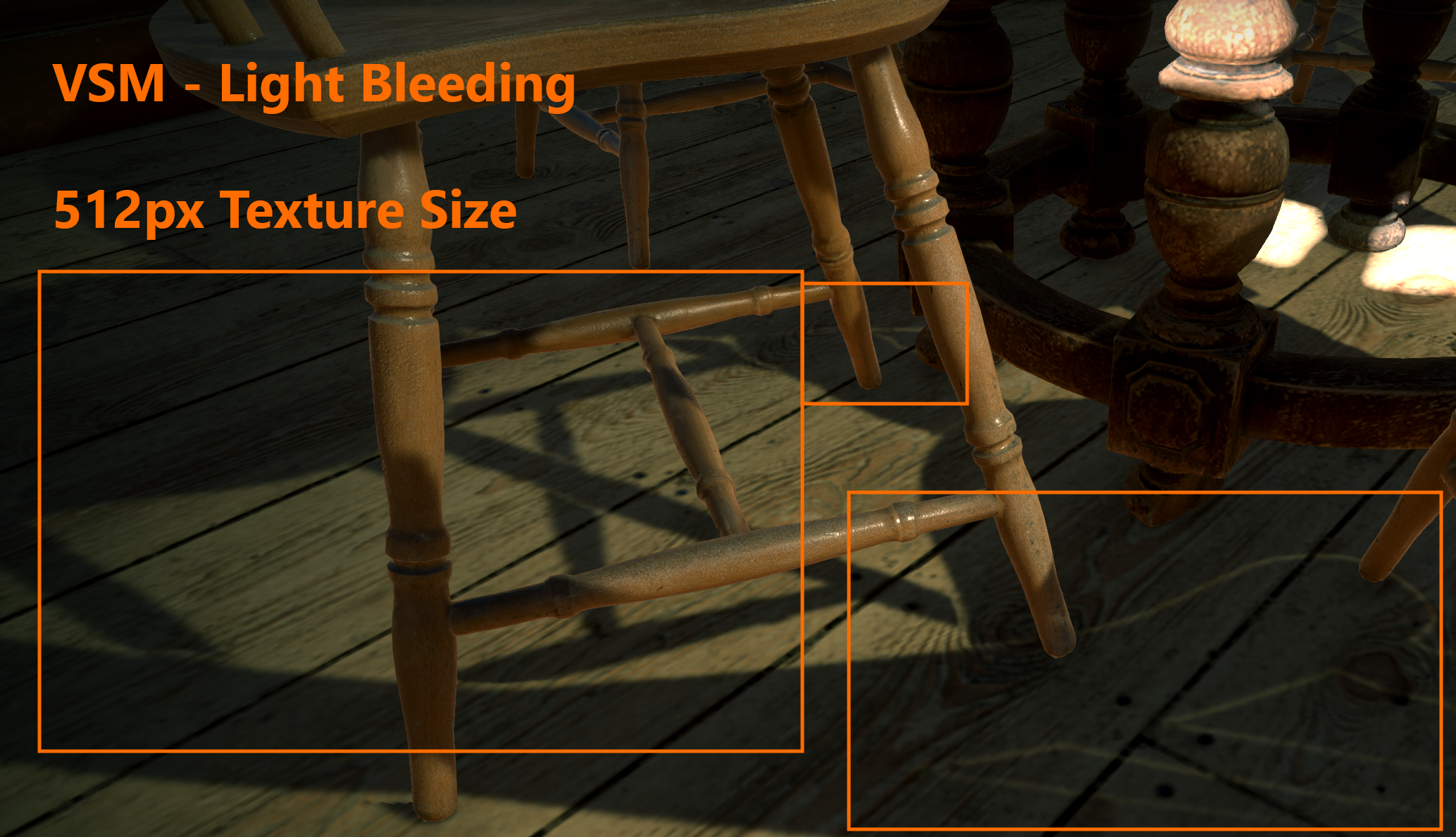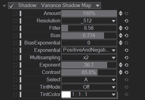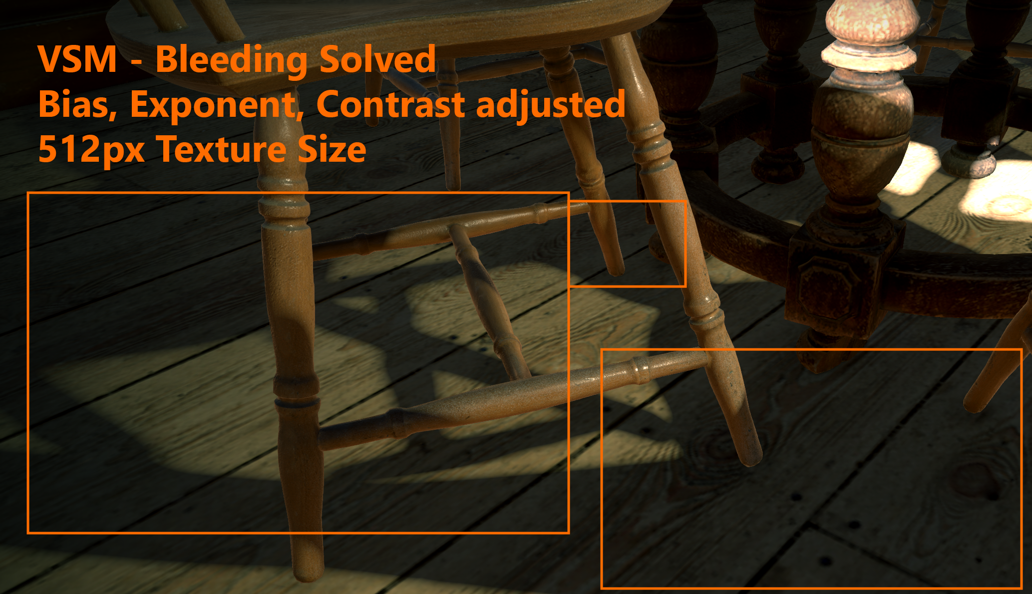 Although acne is rarely a problem with VSMs, there is still a Bias value to tweak if one needs it. These values do not represent any physical units but are laid out in a way that makes them simple to adjust in a 0 to 1 range. VSMs use Bias, exponential VSMs use BiasExponential, this is to enable switching back and forth between VSMs and EVSMs without needing to readjust the bias. The positive and negative modes use the ExponentialBias for positive and the normal Bias for the negative warp.