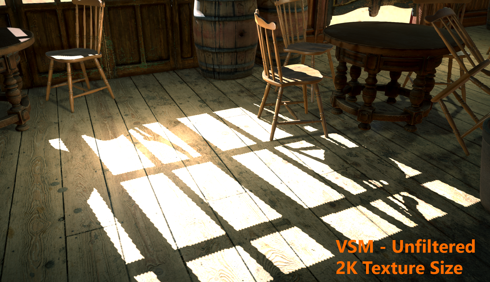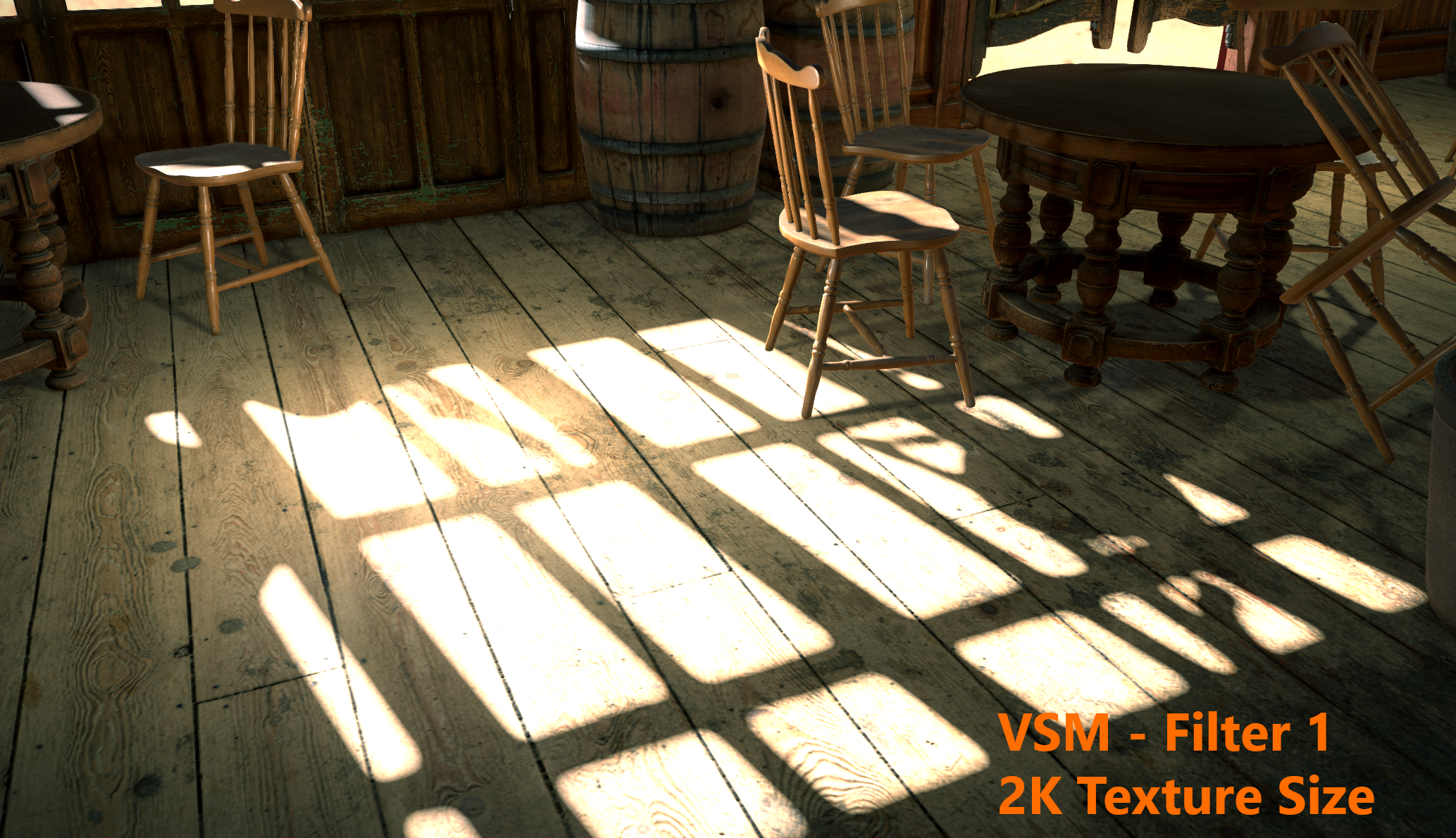 | Variance Shadow Map (VSM) unfiltered | Variance Shadow Map (VSM) filtered |
