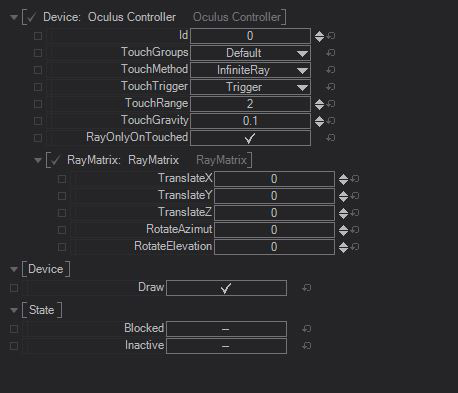 The Tracked Oculus Controller Node provides the tracking information and button presses of the connected Oculus Controller. In the Device section you can change the Id to get information from one of the three supported controllers.