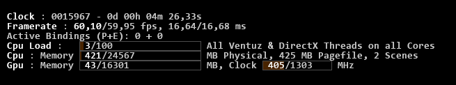 If a Ventuz scene takes 60% on the Main Thread, and no other time-consuming tasks are done (movie replay, heavy load on the DirectX driver), the CPU percentage should show ca. 7%, as the CPU is able to run 8 threads at the same time, and one of these threads is at 60% load.