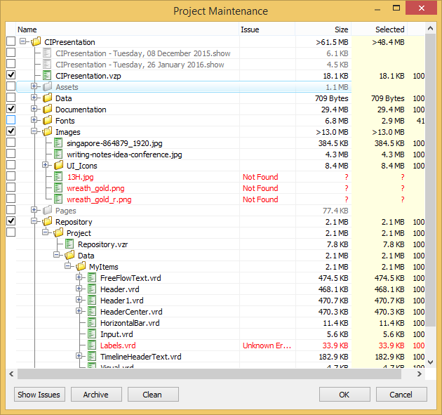 The dialog shows nearly all files and folders within the active Ventuz Project folder structure. There are some filters applied to the file scanning process so that some types of folders and files are not displayed and thus excluded from the maintenance functionality. For instance the Project folders Archives, Presentations, AutoImport and XMS and different kind of version control related files and folders (e.g. Subversion or Visual Source Safe) are excluded. The Project files and folders are displayed in a tree structure with additional status entries per item. Every item has a check box on the left side to allow the user a modification of the selection status. The Issue column contains errors and information. The Size column displays the size of a file or complete folder on disk. Selected displays the size depending on the item selection and % is the ratio of both values in percent.