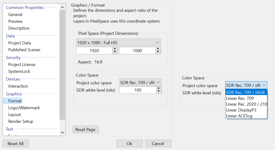 Project Color Space sets the color space for the Ventuz project. The engines calculates color and brightness values in the set space. Where SDR Rec.709 / sRGB is the standard range, non-linear color space, which is the same to pre V7.1 color space. The other color spaces are calculated linear and some contain a wide color gamut. Depending on the HDR Output settings, the color space might be converted for the device output. For more information see: HDR and Color Management Workflow, Color Spaces in the Ventuz Engine, and How To Enable HDR.