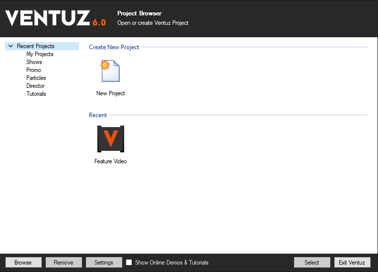 Upon starting Ventuz, the Project Browser will appear as the very first thing: