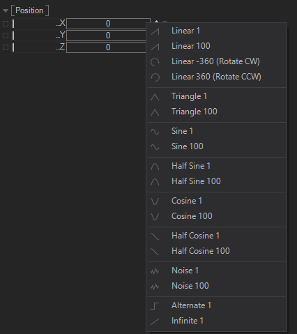 Floating Point Numbers can be animated directly inside the Property Editor using a generic animation similar to those of the Mover Nodes. All other value types need to be bound to either the Output of another Node or to a Keyframe Animation's channel. To create a Floating Point Animation click the button on the right of the property's value's box (it appears when hovering over the property). In the appearing dropdown you can choose a function for the animation and one of several presets for it. See the Mover Node reference for more information on the different functions.