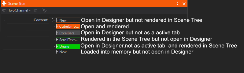 When working with nested scenes and remoting, one can easily lose one's overview of which scene is rendered where. That is why Ventuz provides the Scene Tree (SHIFT-F12):