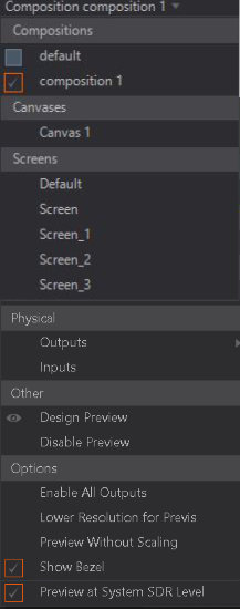 With the Preview Selection Menu it is possible to switch between different Compositions, Previs Screens, Screens and Canvases which are defined inside the Render Setup. These will be then previewed inside the Renderer Window.