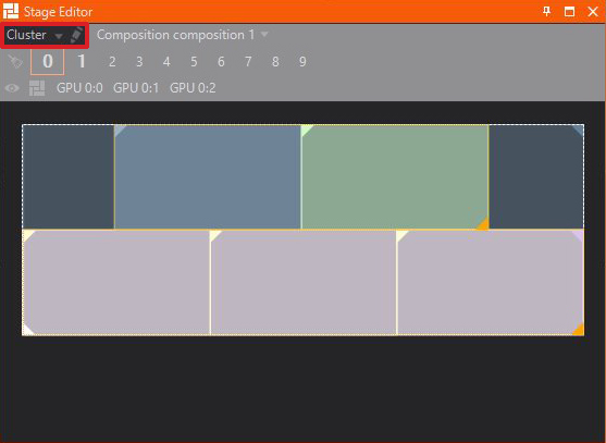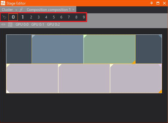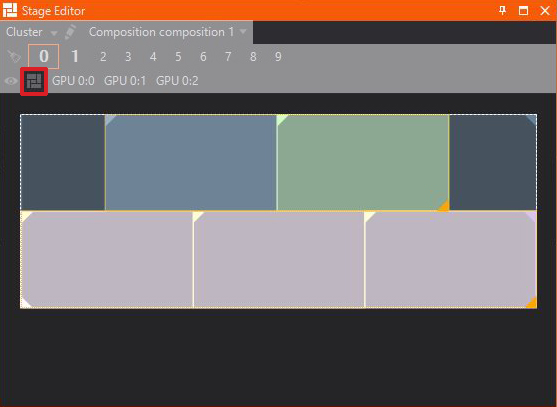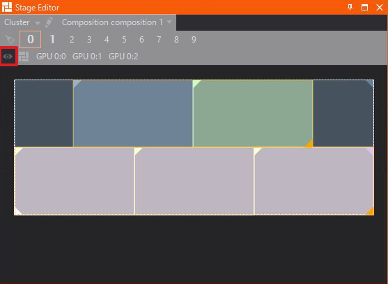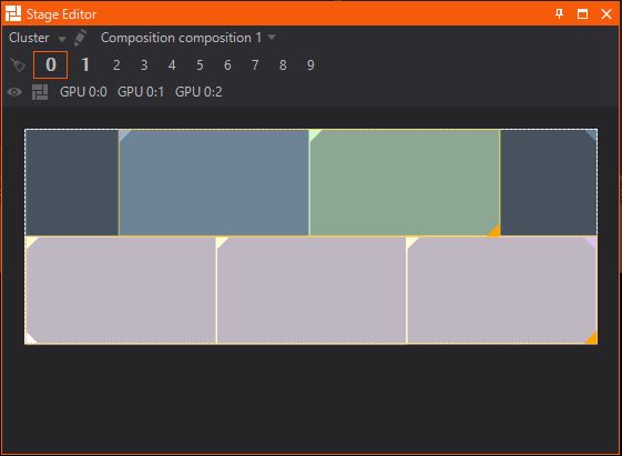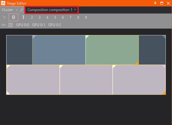 The Stage Editor enables previewing of different Screens, Previs Screens and Compositions as well as outputs and other machines inside a Cluster. Furthermore you are able to switch, edit and create Render Setups quickly.