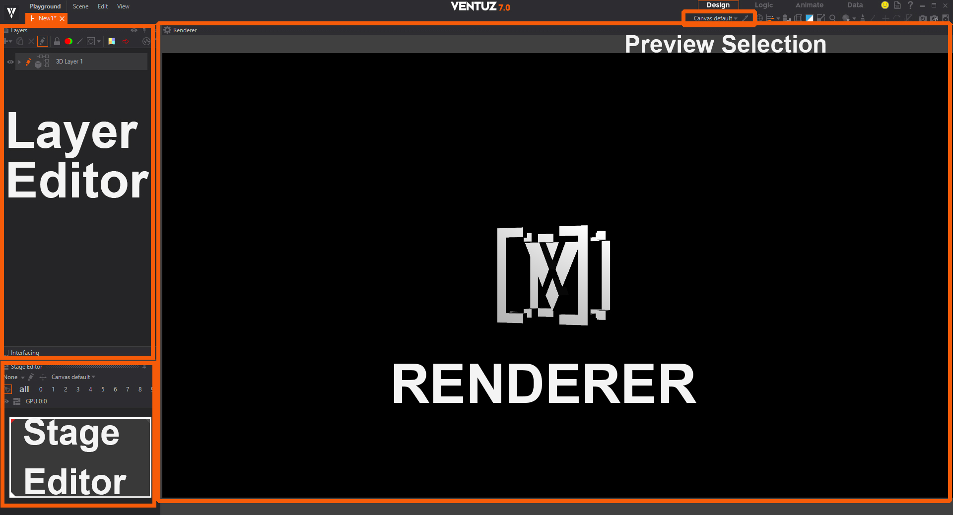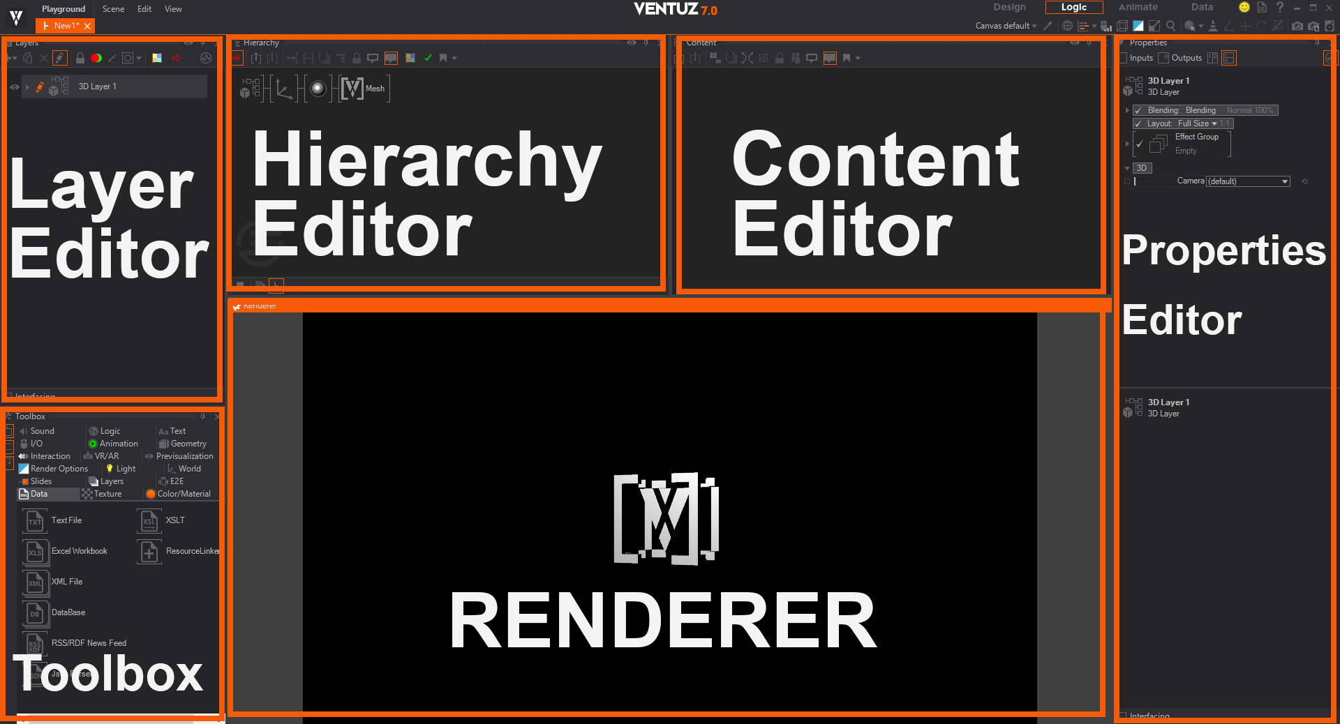 This Layout is made for all the tasks that involve creating complex logic and 3D scenes. It is the closest to previous versions of Ventuz, and apart from the Renderer, it features the Layer Editor, Hierarchy Editor and Content Editor, together with the [Toolbox Toolbox] with the available nodes and the Property Editor to adjust the available parameters.