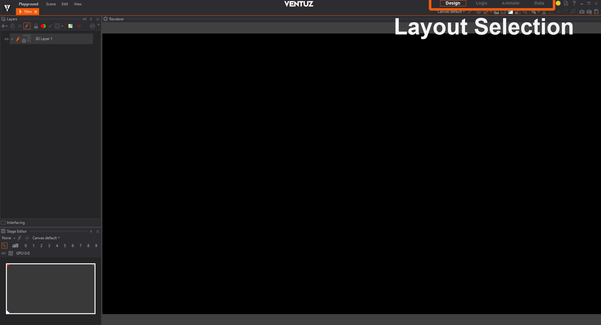 One of the new features introduced in Ventuz 5 is the possibility to create custom Layouts and Tabs to switch between them. By default Ventuz includes 4 different layouts tailored for specific tasks, but these layouts can be edited, customized and saved for later use, depending on each user and project needs. The available layouts are: