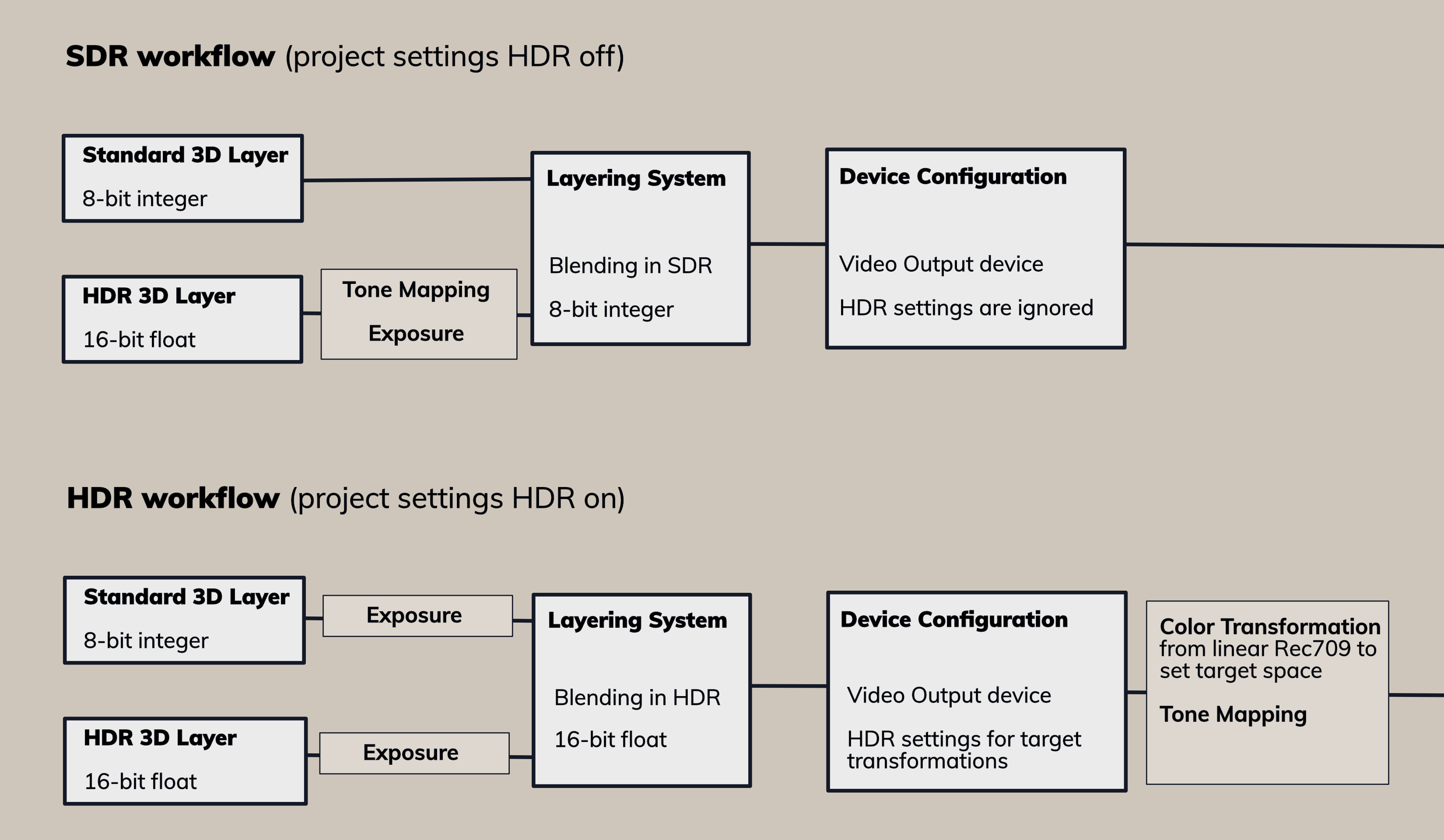For the HDR workflow, everything is calculated in linear 16-bit float except the Standard 3D-Layer, which still uses 8-bit and then is transformed to the Project Color Space. The default settings for a Layer are set to High Dynamic Range for the Engine property.