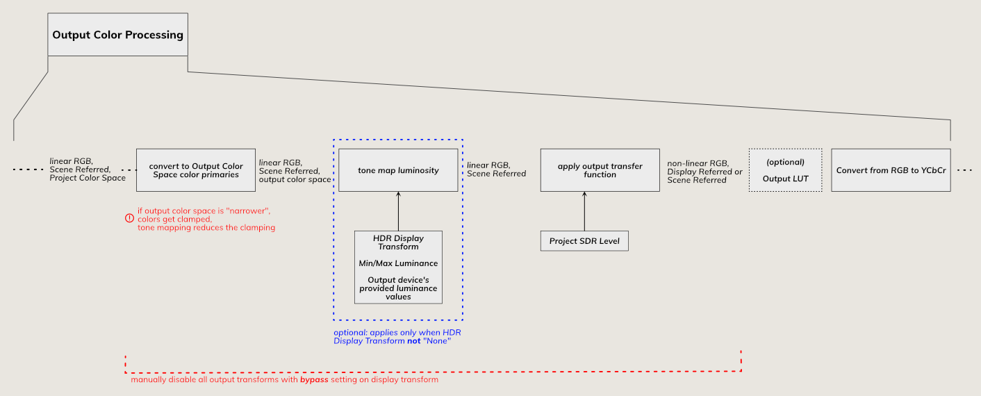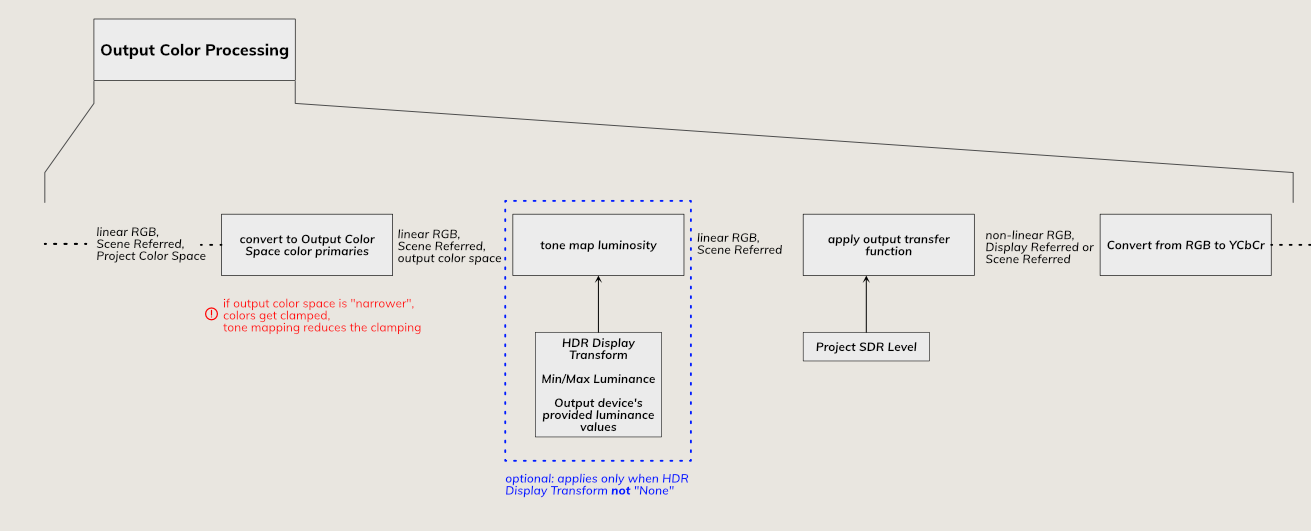 Next, the output transfer function is applied. For display-referred out streams, like all GPU outputs, the Project's SDR Level is used to encode the data to the correct brightness values. If necessary, the color channels are converted to YCbCr. Again, this is done via a shader on the GPU, per frame, before it is displayed.