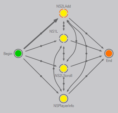 Note that each transition can be valid in only one of its two directions or both at the same time. For example, there is a transition from NS2LAdd to NS1L that works in both directions. If one is currently active and then replaced by the other, that special transition is used instead of going to End and then starting at Begin again. On the other hand, the template engine cannot go from NS2LAdd to NS2LScroll via Begin as the transition from NS2LAdd to Begin is not valid in that direction. The direction of a transition can be changed by selecting a transition and pressing R.