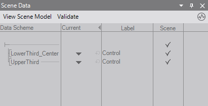 The first point should be quite familiar for anyone that has worked with the Slide Manager Node or more generally the Keyframe Animation Node. The second part is achieved by simply adding the animation's control property to the scene's Scene Data. Upon importing a scene, Ventuz Director scans the scene's Data Model for all animations and then creates entries in the Template Browser for each present state in them. In the example shown above, there would be four templates visible inside Director: NS1L, NS2LAdd, NS2LScroll and NSPlayerInfo.