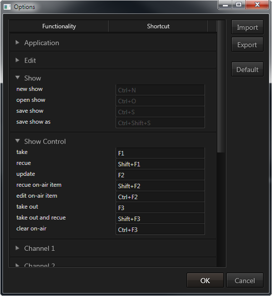 Starting with Ventuz Director V4.05, keyboard shortcuts can be customized by the user. The short cut manager can be found in the main menu under Tools / Shortcuts. The shortcut layout is stored in the user settings on a machine. To transfer a layout to other users and/or machines, use the export and import buttons.
