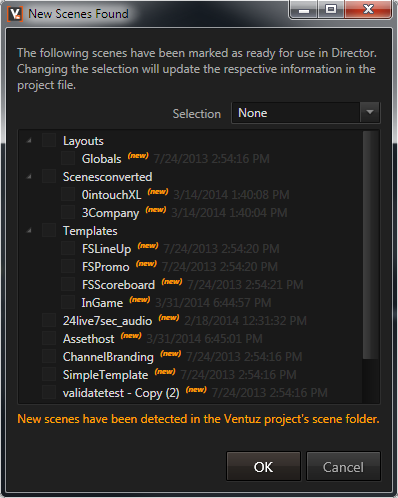 A Ventuz Project file contains a list of scenes that have been marked as ready for usage in Director as opposed to work in progress or none-template scenes. If a show is opened and new scenes have been detected, the operator is presented with a dialog where he can mark the scenes that are ready for use.