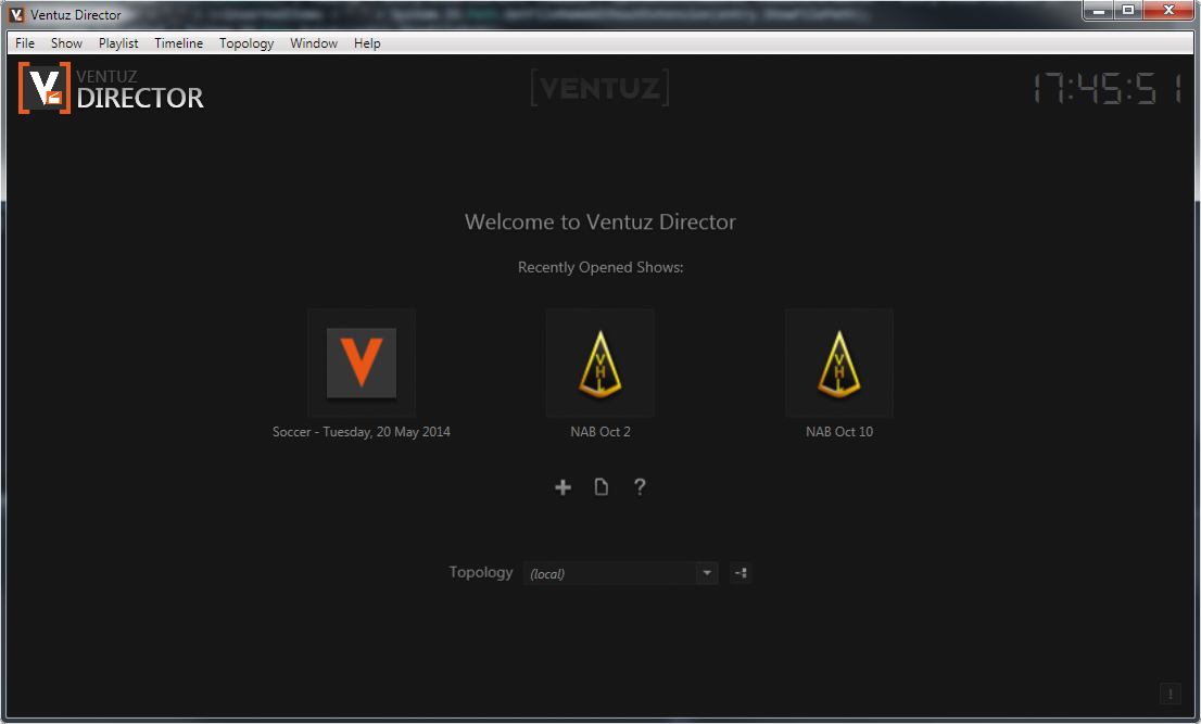 When launching Director or closing the active show, a simple launch screen is shown inside the Director's work area instead of the usual docking environment. In the center, the three last opened shows are shown. Underneath it are buttons to quickly create a new show, browse for an existing one or open the user manual.