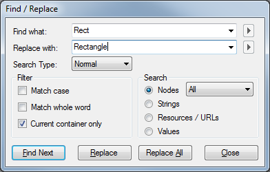 Click on the arrow button on the right side of the Find what field to see all available wildcard characters. If the search category is set to Resources / URLs the arrow buttons can be used to specify a certain resource file in a File Browser. This makes it possible to replace all occurrences of e.g. a certain image with another image.