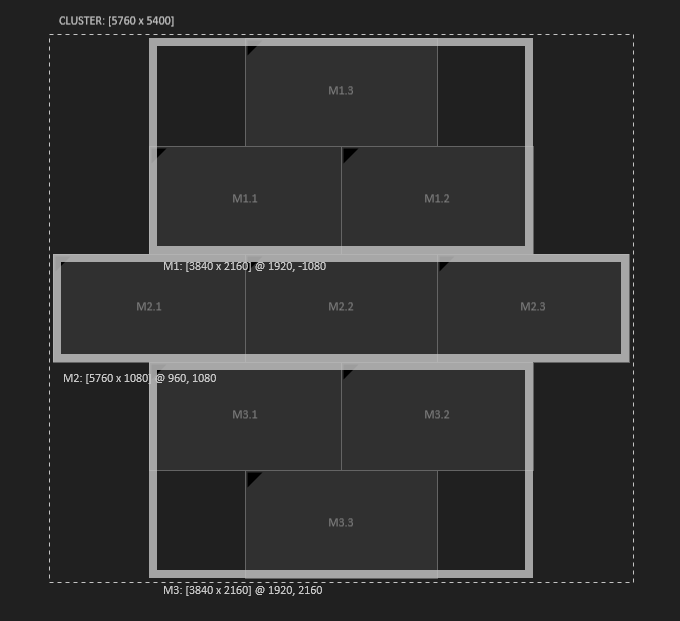 If you want to create a Setup without being connected to the real cluster machine, launch the Create New Setup dialog and select the Advanced tab. Displays Total must be set to 3x3; fill in the correct resolution and increase the Num. of Machines to three! Make sure that Displays per Machine is set to 3x1 (an arrangement of 1x3 would be possible but would not give the optimal result).