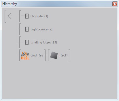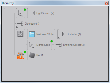 Now we need to create the setup to use the shader correctly. The main task will be to create that input texture which contains the masked light source geometry. Let's start by putting the HLSL node into a Hierarchy Container. Rename the existing Output to "Occluder" and add two additional ones: "Lightsource" and "Emitting Object". We also add the aforementioned Rectangle behind the HLSL shader node.