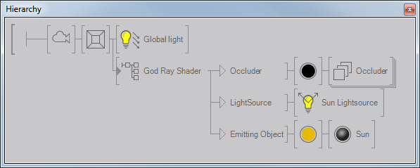 A "God Ray" shader is a classic image space post processing shader. It mimics the light streaks emanating from a bright light source when it is surrounded by a participating medium such as mist. The shader - from a top-level perspective - consists of two elements: A geometry that represents the light source as well as a number of occluders that can block the light of sight towards the light source.