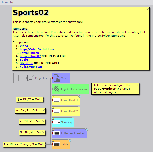First, let's have a look at the existing scene. Open the project and load the scene Sports02_CustomVideo. It provides examples for on-air graphics for a sports event. Looking at the Hierarchy Editor from top to bottom we find the following components: