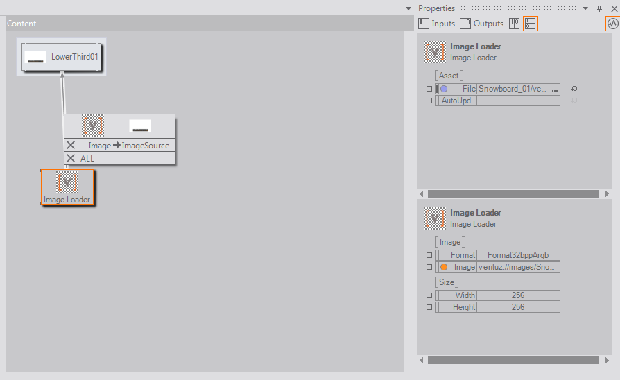 Binding the logo needs some extra attention. The !LowerThird01 Container has been designed to receive an image, so we can not bind it directly to our Project Data. Instead take an Image Loader and bind the File Property to the Project Data Channel called Logo. Then bind the outputted image of the image loader to the according input of !LowerThird01.