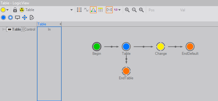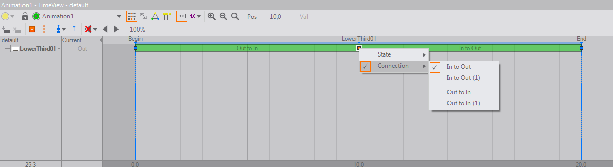 Adding states on the way to the present state leads to a so called Multi-take Template. The path from the normal state called Table to the state called EndTable is for taking the Table off air with a proper animation when not doing all takes of the Template. Of course this path needs to be animated in the Time View like any other. The screenshot shows the different slices.