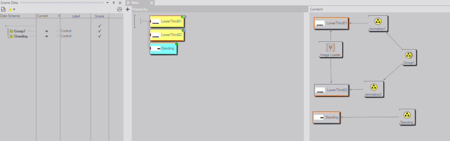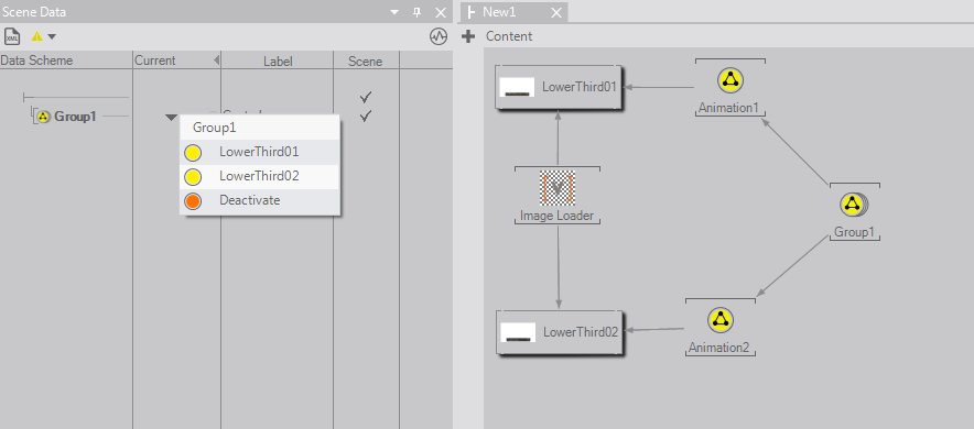 click and choose Delete from the context menu. Now add an Animation Group Node to the scene and bind the Control properties of the two animations to it. Lastly add the Control property of the Animation Group to the Scene Data. Have a look at the Scene Data Editor. Now one of the two Lower Thirds can be chosen, but not both at the same time.
