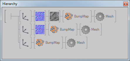The BumpMap shader will use the Texture assigned to the first texture stage as its normal map. The easiest way to achieve this is by ensuring there is no Texture Node before the one that assigns the normal map. Additionally, all textures must be placed before the Shader node in the Tree Hierarchy! If no BumpMap texture is present, an internal default texture is used. The following hierarchy shows different valid combinations: