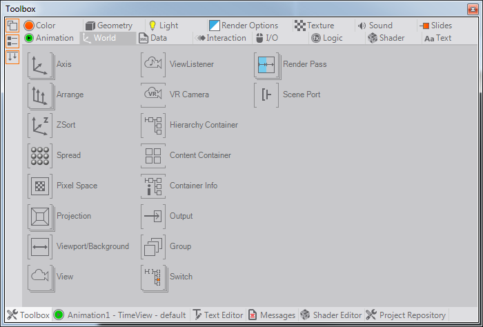 The Toolbox contains all the Nodes that ship with Ventuz. Each node is either a Hierarchy Node (brackets to the left and right of the icon) or a Content Node (brackets at the top and bottom of the icon) and belongs to exactly one category (i.e. World, Interaction, ...). Some of the entries shown in the Toolbox represent more than one node which is visualized by lines to the lower right that represent a stack underneath the icon. click