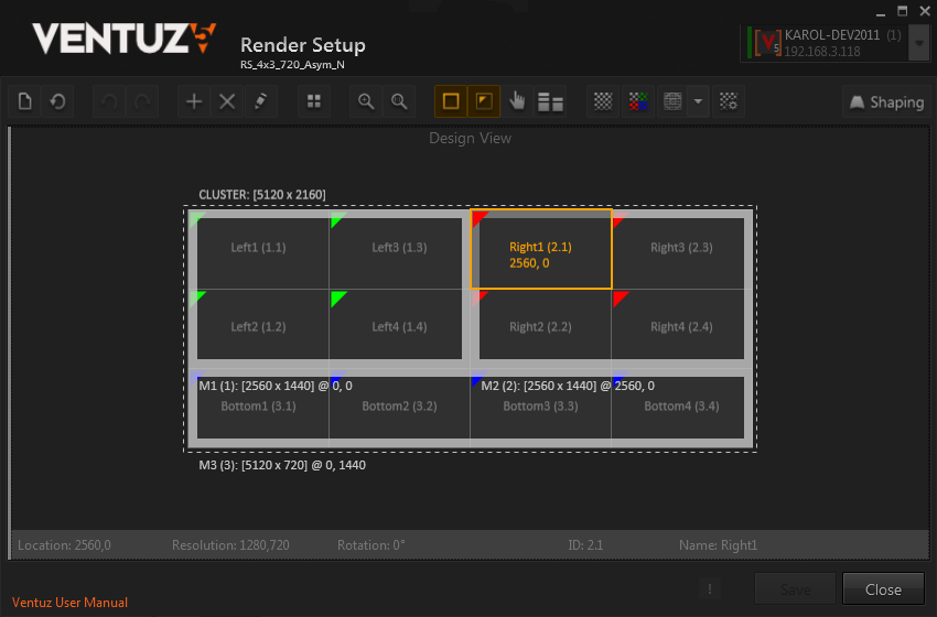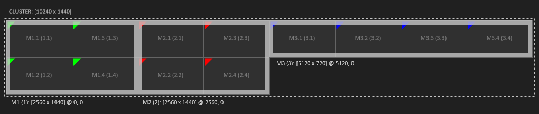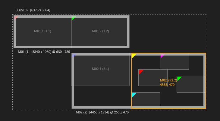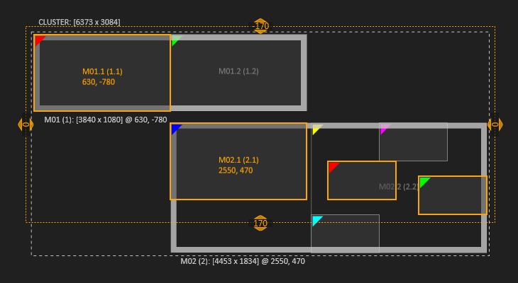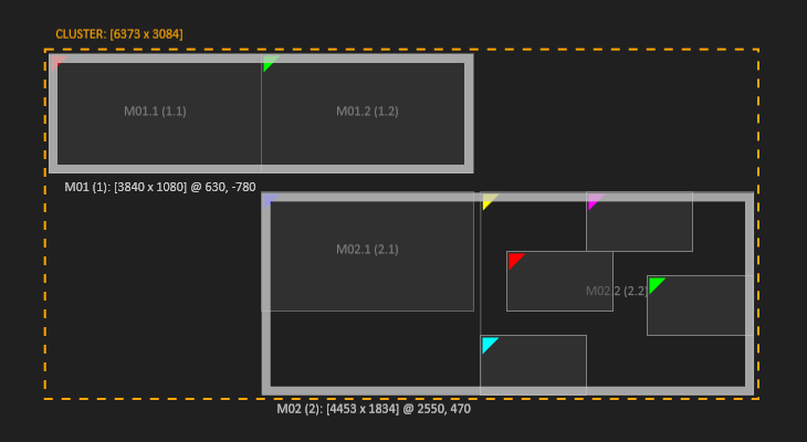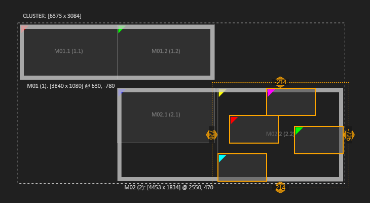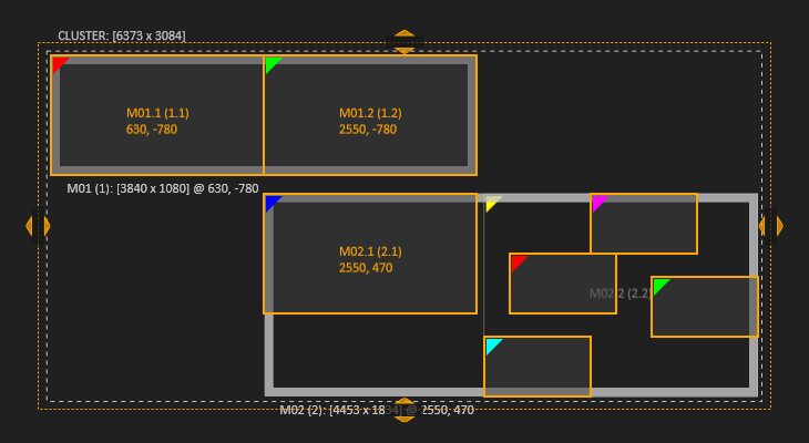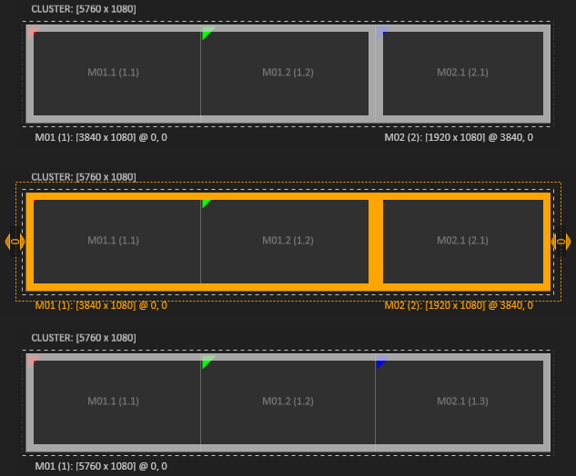 After having created an initial setup that matches the actual graphic board output and machines, the elements like machines, displays and split fragments of a display can simply be moved to match the desired design setup. (Compare Screenshots in section Logical vs Visual Resolution above)