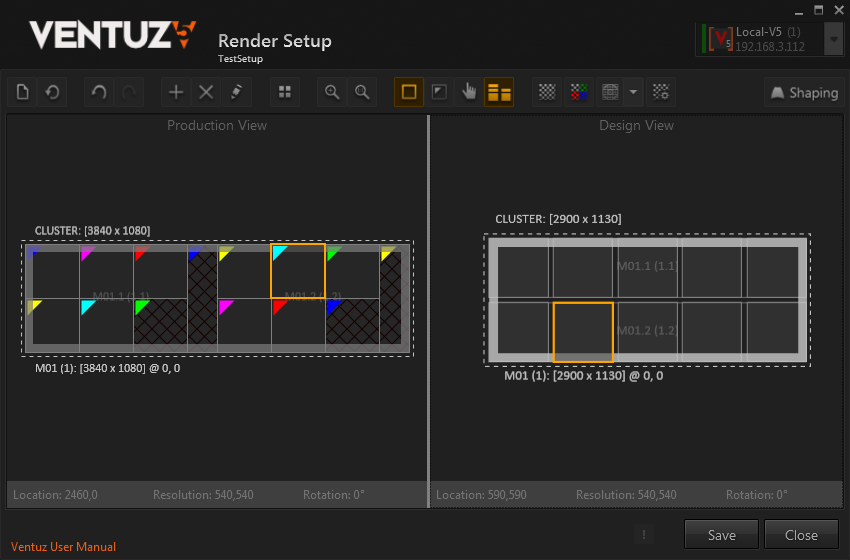 In the screenshot above, two 1920x1080px outputs are used to feed ten 540x540px LED Panels. The fragments that were not needed have been deleted in the Design View and appear cross-hatched in Production View.