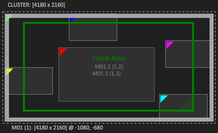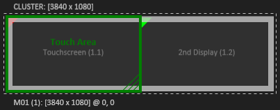 The Touch Area allows remapping of incoming touch data to a custom area of the cluster. Ventuz' Input Subsystem receives the touch data from attached touch devices. The touch is interpreted in normalized coordinates from 0,0 to 1,0 from the top left corner to the bottom right corner. By default, this touch information is applied to the whole cluster canvas the same way, 0,0 top left to 1,0 bottom right. When the Show Touch Area button is enabled in the toolbar, the touch area is represented as a green rectangle. By default, it is locked to the cluster, which results in the default behavior described above. To adjust the touch area, it has to be unlocked via the context menu or the keyboard shortcut CTRL + U. Now the touch area can be adjusted. The size can be changed by  click+drag the bottom left green hatched corner of the touch area. It can be moved just like any other element.