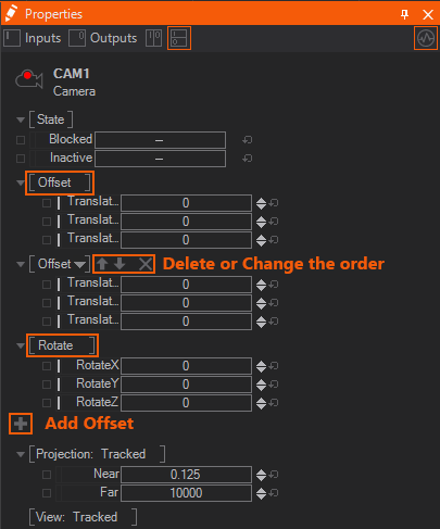 An Offset allows you to translate the Camera by the TranslateX,Y,Z properties. The Rotate provides Rotate X,Y,Z to rotate the Camera.